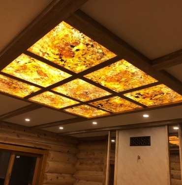 Световое панно из каменного шпона Falling leaves в кессонном потолке, состоит из 9 самостоятельных светильников с периметральной подсветкой. Цена указана за 1 светильник 600*600*50